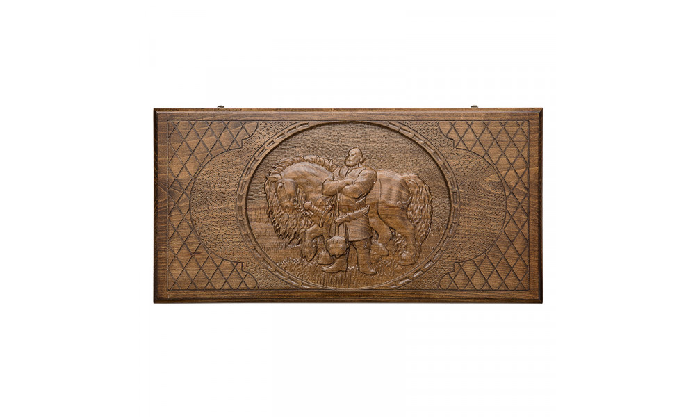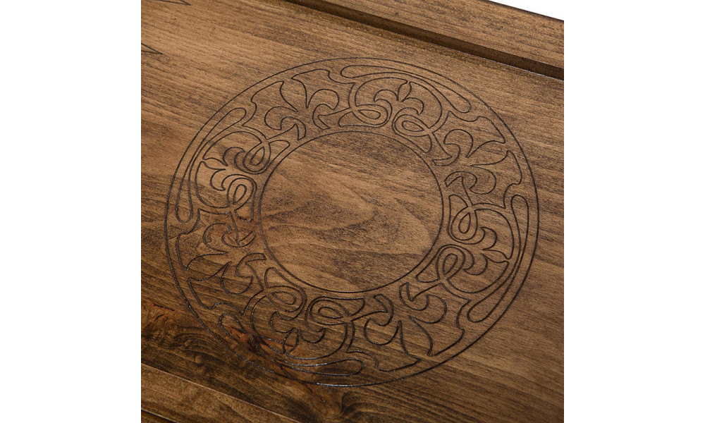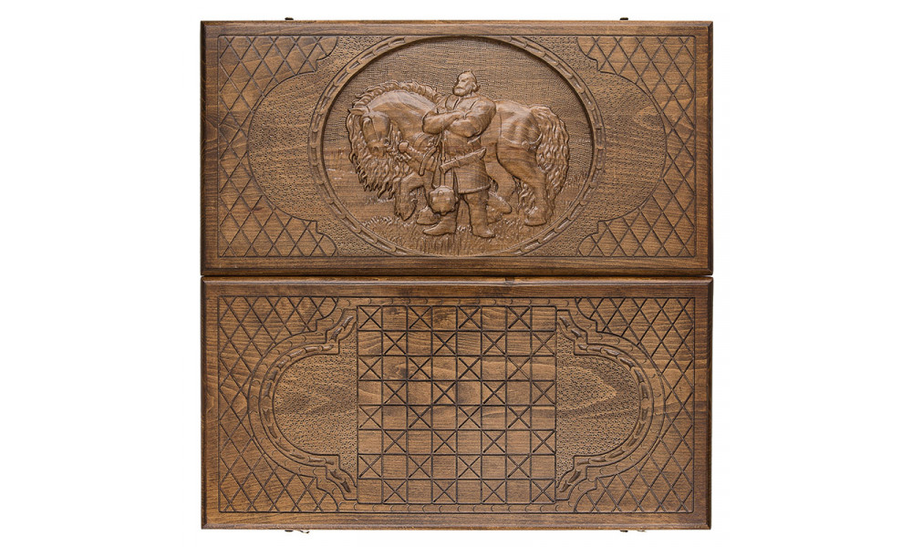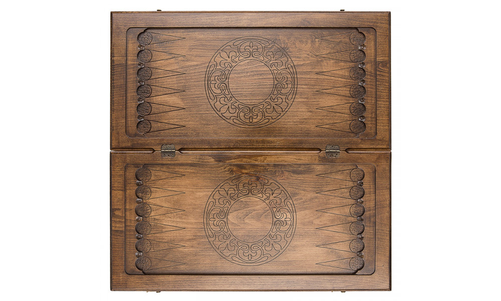 Лицевая сторона украшена изысканной резьбой, причем где-то используются геометрические фигуры, в других местах все округлое, а в третьих и вовсе теряешься в разнообразии. На обратной стороне имеется поле для игры в шашки, для чего можно использовать комплектные фишки. Они позволят расслабиться после напряженной партии в нарды. Изнутри створки украшены по центру круглым символически узором, а каждая отдельная ячейка дополнительно подчеркивается мелкими деталями.